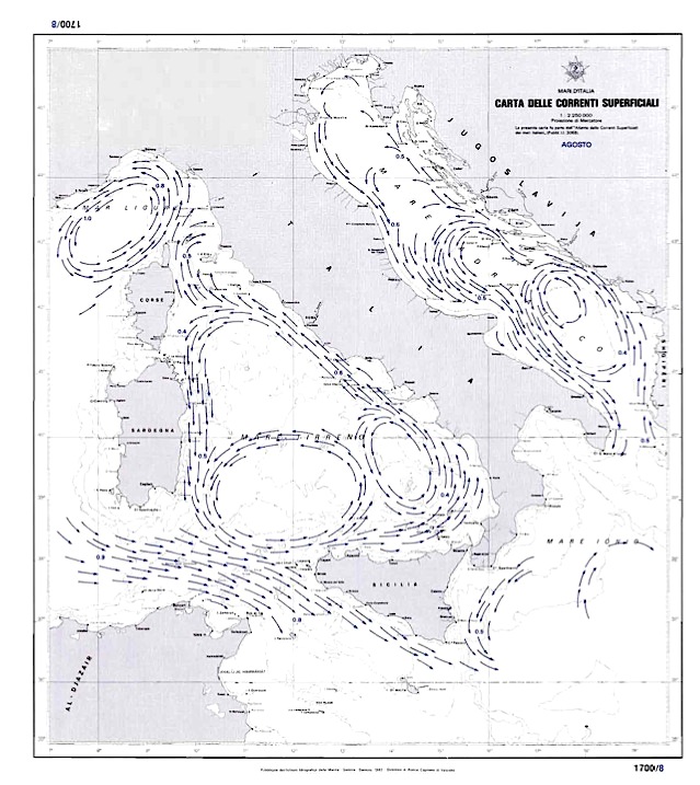 Carta delle correnti superficiali dei mari d'Italia - agosto