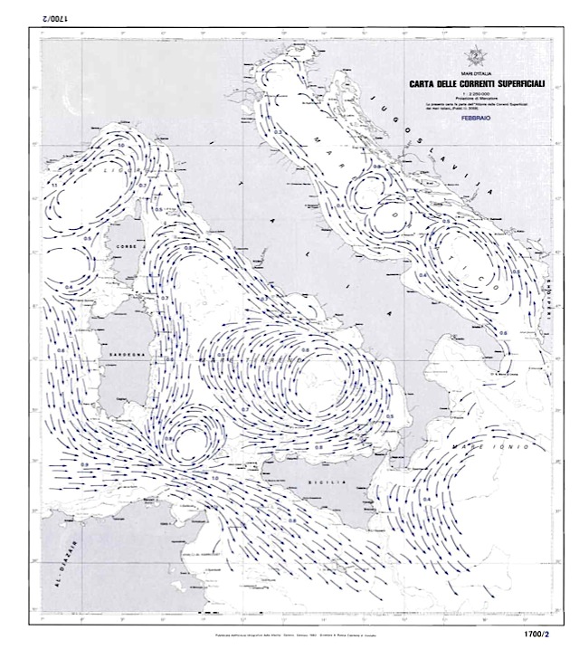 Carta delle correnti superficiali dei mari d'Italia - febbraio