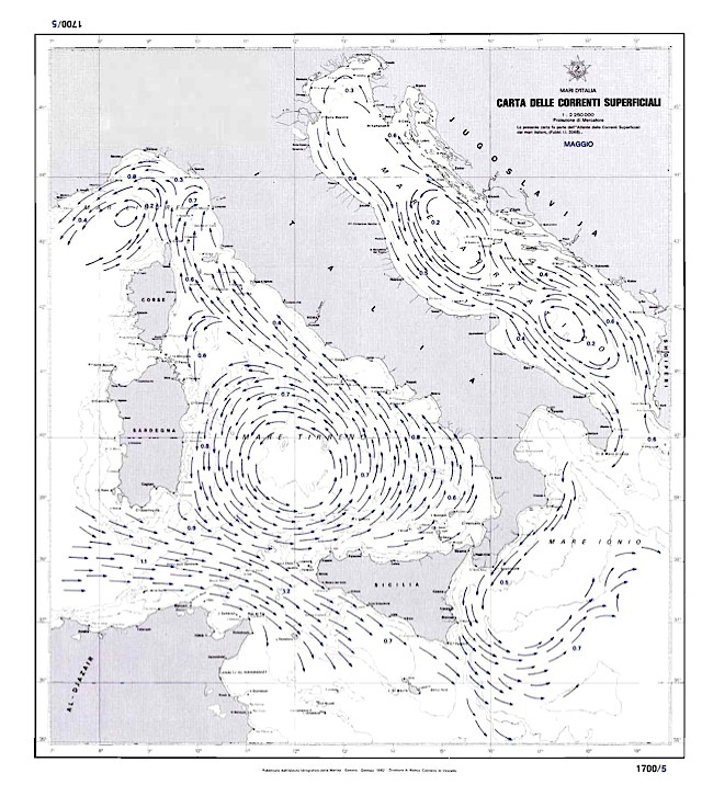 Carta delle correnti superficiali dei mari d'Italia - maggio