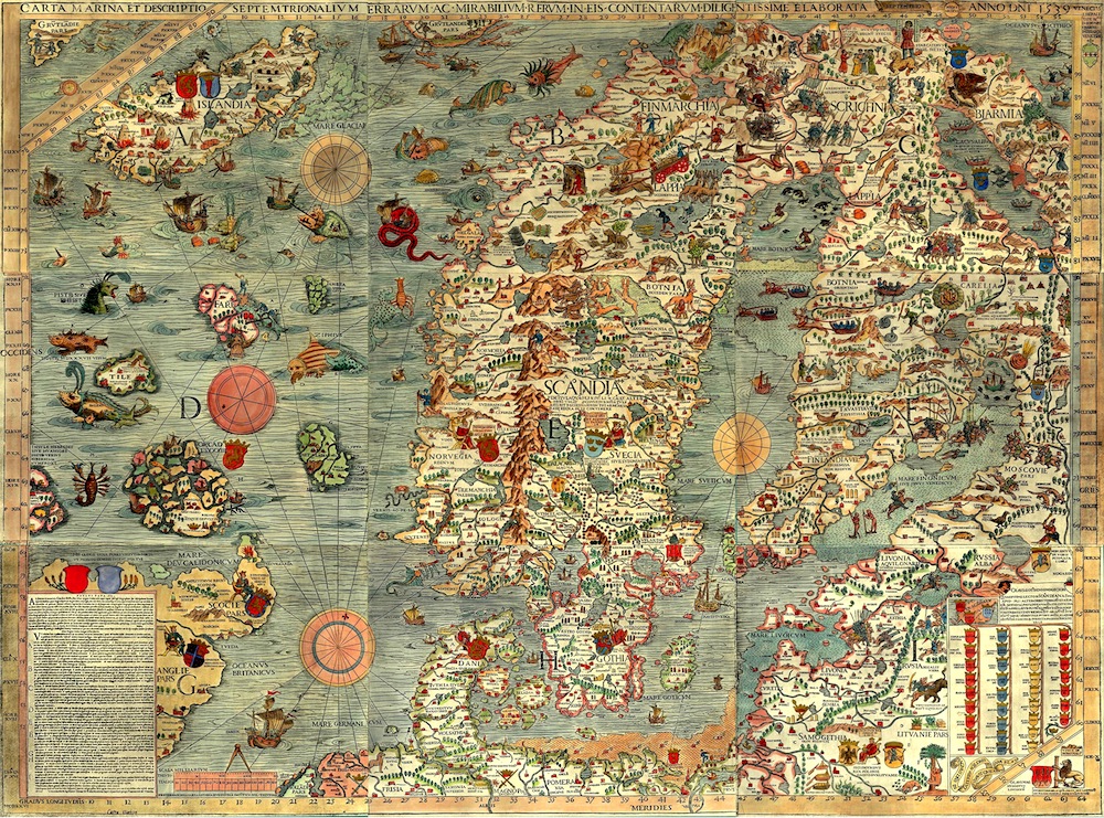 Chef-d’œuvre de la cartographie vénitienne du XVIe siècle, la Carta Marina constitue l’une des premières représentations précises de la mer Baltique et des terres qui lui sont limitrophes, depuis la péninsule scandinave jusqu’à l’Islande. Surtout, elle est l’illustration d’un imaginaire autant que d’un territoire, et la géographie avérée y côtoie les créatures fantastiques, les contrées légendaires et les scène épiques. Format de la carte dépliée : 675 x 500 mm