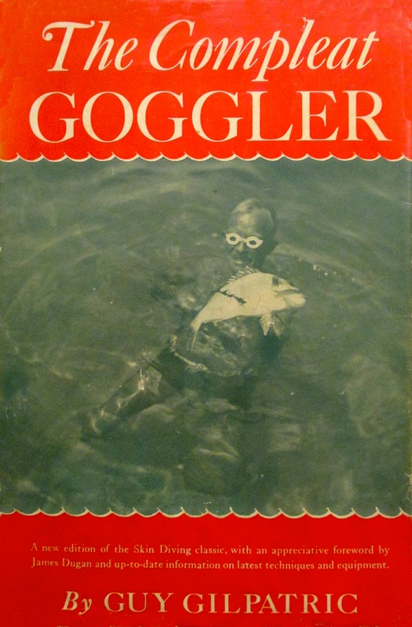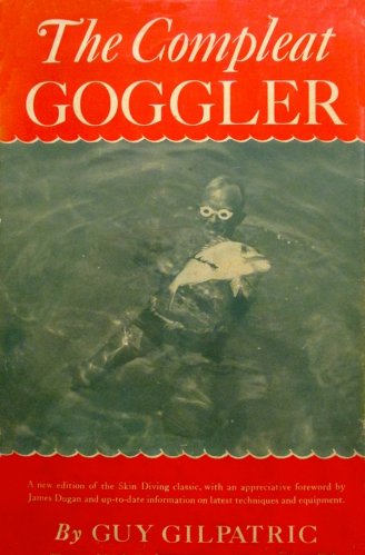 That most noble and excellent sport perfected and popularised by Guy Gilpatric in the Mediterranean Sea, though long practiced elsewhere by other benighted savages: Setting forth the proper manner of making the goggles, spears and other needful gadgets together with descriptions of many marvels witnessed upon the bottom of the sea and fully exposing the author's cunning methods of swimming, diving and spearing fish and octopi. Gilpatric was a one-time pioneer aviator and then fighter pilot on the Western Front who turned to journalism and novels after the war. Returning to France, he settled on the Riviera where he discovered swimming goggles and fish-spearing. Without wanting to minimise Cousteau's achievements, this book does put him into context; "Commandant Le Prieur wearing his self-contained diving gear. .The cylinder contains a half-hour's supply of compressed air. With this simple apparatus, the inventor and many others dive for sport, science and salvage." Chapters include: Genesis; Merou; Octopus; Goggles; Spears; Swimming and diving; Guns; Fish; Gadgets; Cooking; Garglings of a garrulous goggler, witnessing wonders, telling lies, exploring wrecks, and hunting treasure. "Mr Steve Butler, the English librarian of Juan-les-Pins, made himself a gadget with which he often swims an hour at a stretch without lifting his head for air. It is simply a tube which curves around the back of his head, like a periscope. He either ties it around his neck or holds it in place with wide rubber bands. Due to his rather considerable coefficient of buoyancy, Mr Butler is unable to dive fast enough to spear fish, and uses this device for hunting mermaids."