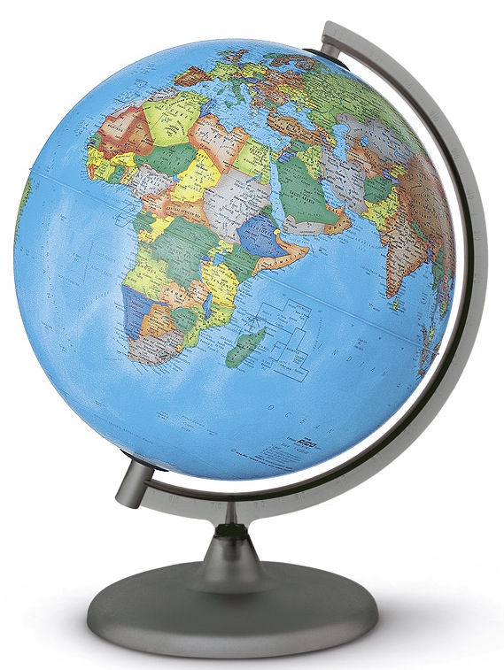 Cartografia politica, ogni paese è contraddistinto da un diverso colore. Base nera e meridiano fumè con indicazione della latitudine espressa in gradi.