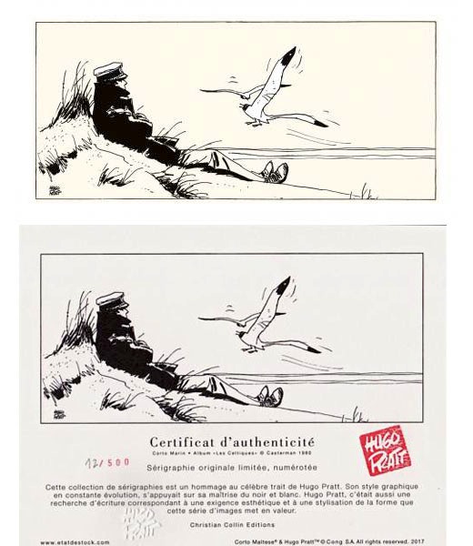 Sérigraphie accompagnée d'un certificat pour chaque format + tampon à sec reprenant la signature de Hugo Pratt; ainsi que deux tampons au dos de la sérigraphie. Format 50x100cm numéroté limité à 250 ex.