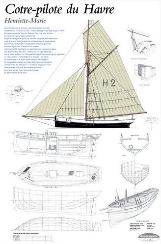 Henriette-Marie est le premier cotre-pilote du Havre connu. Probablement construit en 1847, il aurait pratiqué le pilotage jusqu’en 1870. Ses plans, relevés en 1866 par Armand Pâris, ont servi de base au travail de Claude Maho, présenté ici. Inspiré des barques de pêche de Trouville, réputées pour leur bonne tenue à la mer, Henriette-Marie est un bateau rapide, relativement bas sur l’eau et maniable. Son gréement très divisé peut être manoeuvré par deux hommes et un mousse. Les cotres-pilotes étaient surnommés par les capitaines au long cours les « hirondelles de la Manche » en raison de leur vivacité et de leurs coques noires à pavois blancs. Plan de modélisme, poster à encadrer, poster grand format 60 x 40 cm, papier luxe.