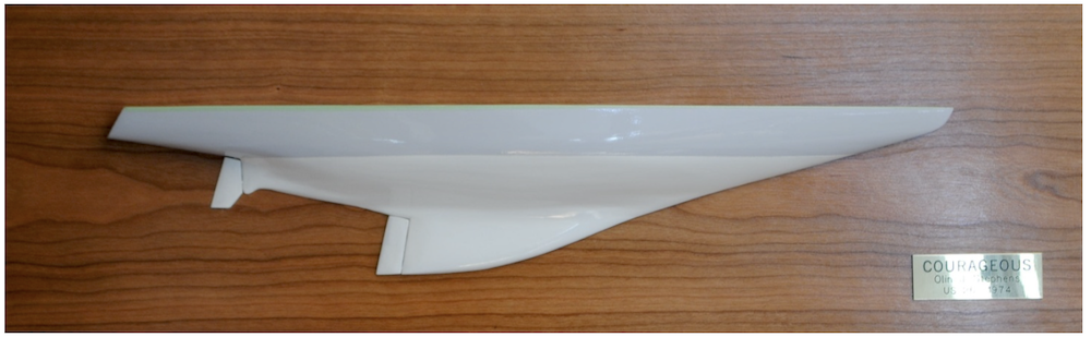 Courageous has beendesigned by Olin Stephens with the assistae of David Pedrick for the 22nd 1974 America's Cup; she is another landmark in the design of Twelves being the first 12mR built in aluminium alloy according to the Lloyd's scantling rules new standards authorizing this material in the building of Twelves. This means an advantage of about two tons in the weight of the hull and in fact Courageous is a light boat, quite conservative in her lines and very elegant. Also, the availability of lighter material encouraged new thinking about hull form. Courageous' geometry represents a new interpretation of the 1967 Intrepid. As designed, the lighter aluminum hull suggested extra ballast, and that made possible a slightly shorter and finer ended hull than the earlier boat, with lower profiles at both ends. She is one of the first Twelves having a computer systems installed on board enabling tuning and sail testing. The Defense Trials were raced between Courageous, Heritage, Intrepid and Valiant; the fisrt skipper was Bob Bavier, who was later replaced by Ted Hood. Dennis Conner was the starting helmsman, marking the start of his long career with the America's Cup. She was appointed official defender after beating Intrepid. Courageous handily defeated the Australian Southern Cross by four races to one in the America's Cup Match. In the same year she also won the Chandler Hovey Gold Bowl (NYYC).