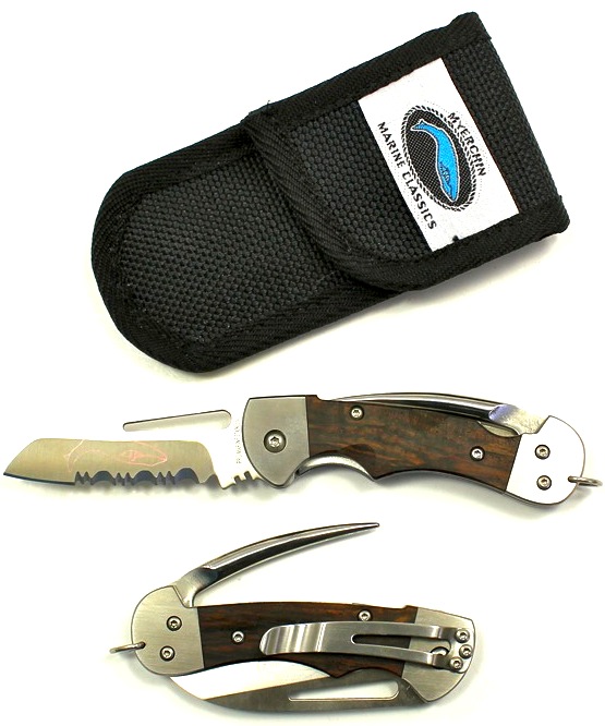 Myerchin Generation 2 Bubinga Wood Handle Pro 3/4 Serrated Blade Folding Crew Rigging Knife. Our newest design for the seaman who wants the absolute finest rigging knife available. Crafted from Stainless Steel, Bubinga Wood Handle and German Marine Stainless Steel. The Pro-grade German Marine stainless that we use is comparable to 440C for hardness and edge-holding properties with additional anti-oxidation elements added for the final crafting of our knives. Extreme strength and light weight. The Generation 2 Series features our advanced, springless locking mechanism (securely locks blade, spike, or both) / Includes Cordua nylon sheath / belt (pocket) clip / Serial Number / One hand open / 3/4 Serrated Blade. Built on our new heavy duty BF300 Frame, this is a knife that will easily last a lifetime… or two. Warranty: Limited Lifetime (Original Owner) on Springless DoubleLock.