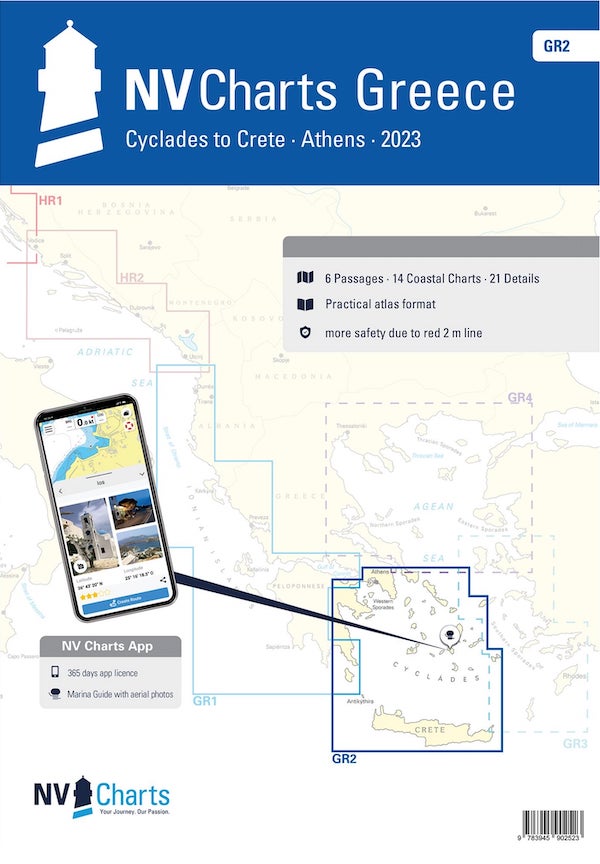 Our chart set GR2 takes you from the Cyclades in the Aegean Sea to Crete. Beautiful villages, white sandy beaches and the typical Greek serenity on the islands make the Cyclades one of the most popular holiday regions for skippers in Greece. The islands are relatively close together, so you can also visit many of the unique islands such as Mykonos, Naxos and Paros with its charming rocky bays on short trips. A unique highlight of the Cyclades is of course the island of Santorini, which, with its whitewashed houses and blue domed roofs, is one of the most beautiful islands in Europe. If you are looking for picturesque bays, wild nature and ancient sites, the island of Syros should not be missed. Here you can marvel at the pastel-colored, classicist villas and historic domed buildings even from the sea. The southern border of the Cyclades is Crete. Crete is the largest of the Greek islands and inspires with its idyllic bays, beautiful beaches and well-developed marinas. The coastal town of Rethymno in the north of the island is definitely worth a visit. In this picturesque coastal town with its narrow streets, you can expect flower-adorned houses in Venetian and Ottoman architecture and still very original island life. The area is equally attractive for sailors and motorboat drivers, you can find additional literature for the region in our online shop under the tour guides. Thanks to the clear structure, the skipper can quickly find approaches, harbours and anchorages and is informed of important navigational details that also appear in the NV Charts app. The chart series impresses with its optimal scales and balanced sheet cuts.