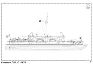 Varata l'8.5.1876 nel Cantiere di Castellammare di Stabia, radiata il 27.6.1909. Una splendida documentazione dedicata alla più potente corazzata del mondo nella sua epoca, rilevata dai piani originali eseguiti presso l'Arsenale della Spezia il 28.2.1881 per l'entrata in servizio della nave. In sette tavole: profili delle ordinate, sezione longitudinale, ponte del cassero, ponte di coperta, n.13 sezioni trasversali e sistemazione delle mitragliere da 25 mm sulle barche a vapore. Era armata con cannoni da 450/20,4 ad avancarica (arma n.2005) e da 120 (arma n.2356). Per i piccoli calibri interessano le armi n.2630, n.2663 e n.2668. Gemella: Dandolo, varata nell'Arsenale della Spezia il 10.7.1878.