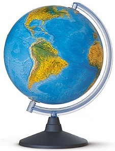 Globo geografico illuminato. Base alta e robusta colore blu e semimeridiano azzurro cristallo.