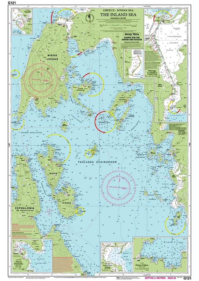 in plastica scala 1:95.000 Plans include: Ó. Ayiás Eufimia (N. Kefallínia) - Ó. Frikou (N. Itháca) - Ó. Fiskárdho (N. Kefallínia) - Vasilikí (N. Levkas) - Dhioriga Levkádhos (Levkas Canal) - Kálamos Harbour