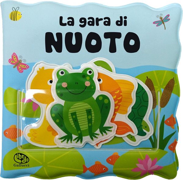 Chi vincerà la gara nello stagno? Prendi i quattro amici dalla tasca e falli nuotare tra le pagine. Puoi attaccarli e staccarli tutte le volte che vuoi, sul libro, sulla vasca o sulle piastrelle del bagno. Decidi tu chi arriva prima!