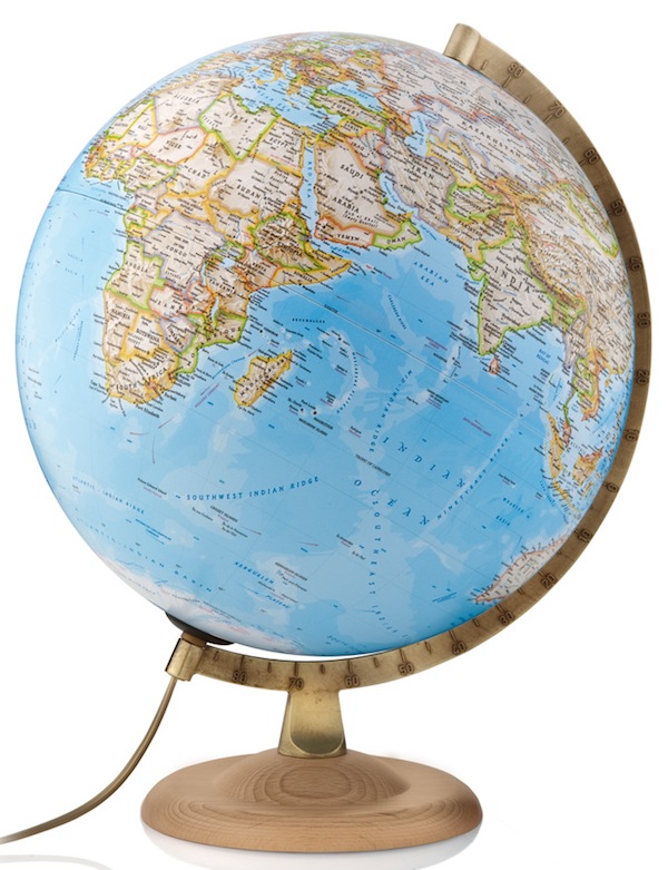 Mappamondo luminoso da tavolo. Accessori di design in legno e metallo.Cartografia National Geographic. La geografia illustrata è classica, politico/fisica.