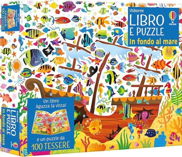 Una confezione con un puzzle da 100 tessere per creare una scenetta piena di creature marine e il libro Aguzza la vista! – In fondo al mare, in formato ridotto. Età di lettura: da 5 anni.