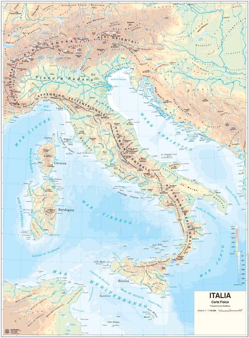 fisico politica murale scolastica plastificata con aste scala 1:1.125.000 cm.97X134