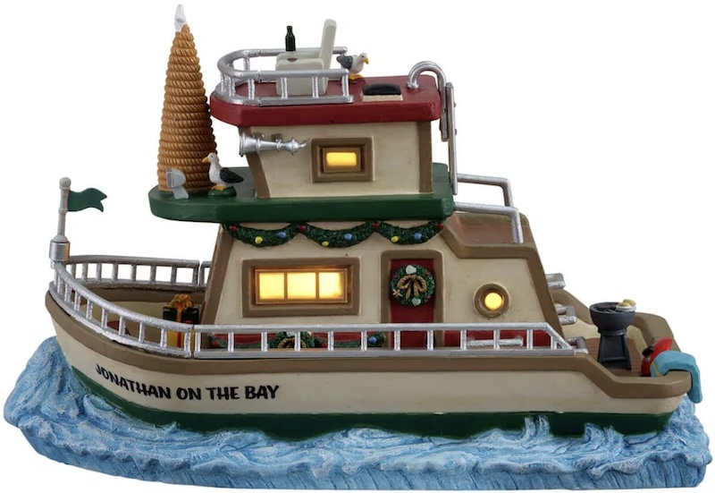 Jonathan's Houseboat on the Bay is ready to take you out to sea for Christmas. The boat is sitting in splashing waves, and it's painted red, white, and green for the holidays. Christmas decorations hang from the top deck and throughout the main cabin. There's even a Christmas tree made entirely out of rope and topped with a starfish. There's also a barbecue on the back deck, and a couple of hungry seagulls looking for food!