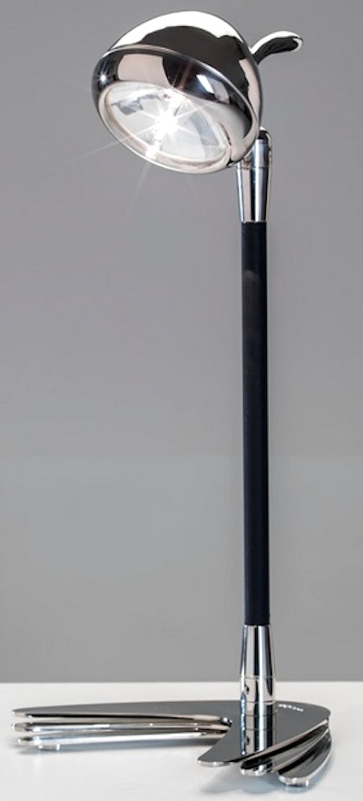 Lampada Aquariva è una lampada da tavolo dal design raffinato, ispirata alla classica Search Light delle imbarcazioni Riva anni ’60 (Aquarama, Tritone e Ariston). Il nome “Aquariva” deriva dall’omonimo motoscafo, in produzione dal 2001, nel quale la lampada è installata di serie. Tanti i dettagli esclusivi e ricercati: l’accensione “touch” con tre gradazioni dell’intensità della luce, lo stelo in mambo nero (lo stesso tessuto delle cuscinerie delle barche), la lampadina a led a basso consumo ed alta efficienza luminosa. Altra raffinatezza di design: la base, realizzata in acciaio a tre sezioni sovrapposte, ricorda il celebre “musone” dei motoscafi Aquarama e Aquariva e, una volta aperta, richiamerà l’elica di un’imbarcazione. Firma il progetto Mauro Micheli, di Officina Italiana Design, mente creativa di tutti i modelli Riva. Sulla scrivania da lavoro, sul tavolino del salotto, sul comodino della camera da letto, Lampada Aquariva è l’accessorio prestigioso che illumina ogni ambiente con eleganza. Caratteristiche - Materiale: acciaio Misure: cm26x20x58; Peso: 3,8 Kg Alimentazione 220 volt. Lampada a LED Stelo rivestito in tessuto mambo.
