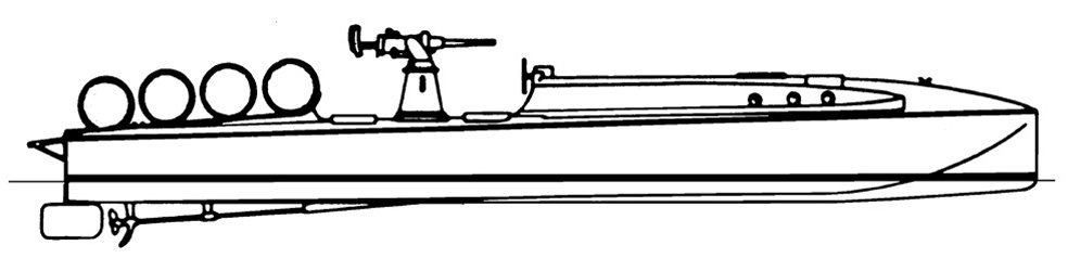 I primissimi MAS della Marina italiana, entrati in servizio nel 1915 a titolo sperimentale come siluranti, trasformati dal dicembre 1916 in posamine con una dotazione di 4 torpedini ad ancoramento tipo Bollo. Da un piano dell’ing. Bisio della Ditta S.V.A.N. (Società Veneziana Automobili Navali): vista di fianco, sezione longitudinale, semivista dall’alto e semisezione orizzontale.