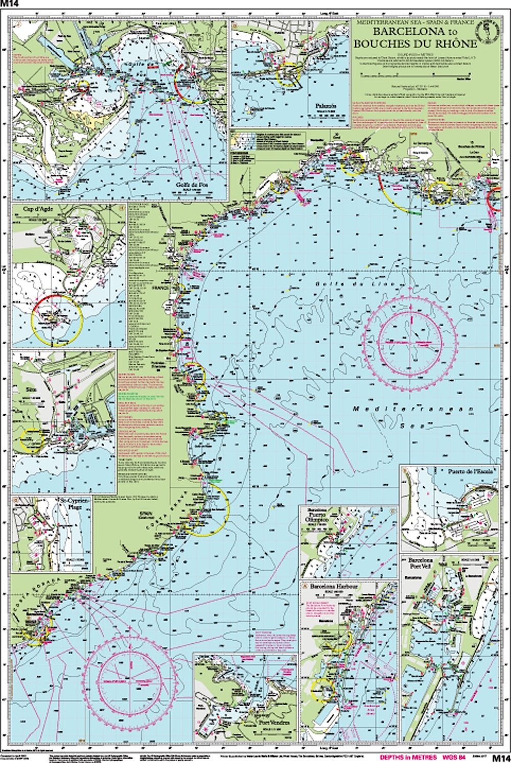in plastica scala 1:440.000 Plans included: Barcelona Harbour scale 1:65.000; Barcelona Port Vell scale 1:15.000; Puerto Olímpico scale 1:15.000; Palamós scale 1:15.000; Puerto de L’Escala scale 1:10.000; Port Vendres scale 1:17 500; St-Cyprien-Plage scale 1:15.000; Cap d’Agde scale 1:20.000; Sète scale 1:22.500; Golfe de Fos scale 1:70.000.