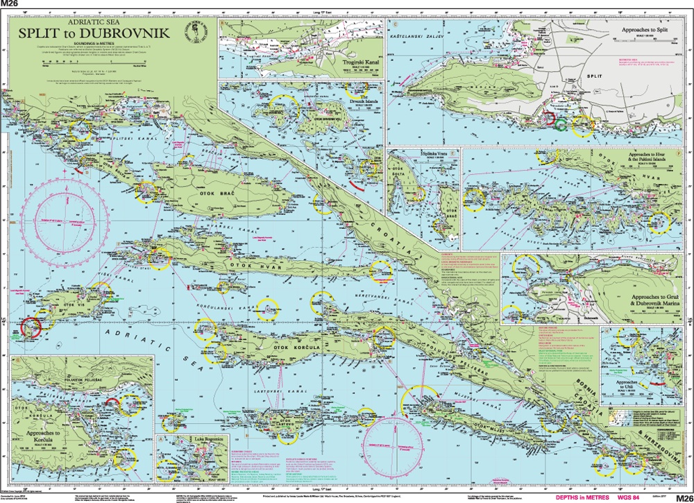 in plastica scala 1:220.000 Plans included: Luka Rogoznica - Trogir Marina - Approaches to Split - The Drvenik Islands - Splitska Vrata - Approaches to Hvar & the Pakleni Islands - Approaches to Korcula - Approaches to Ubli - Approaches to Gruz & Dubrovnik Marina.