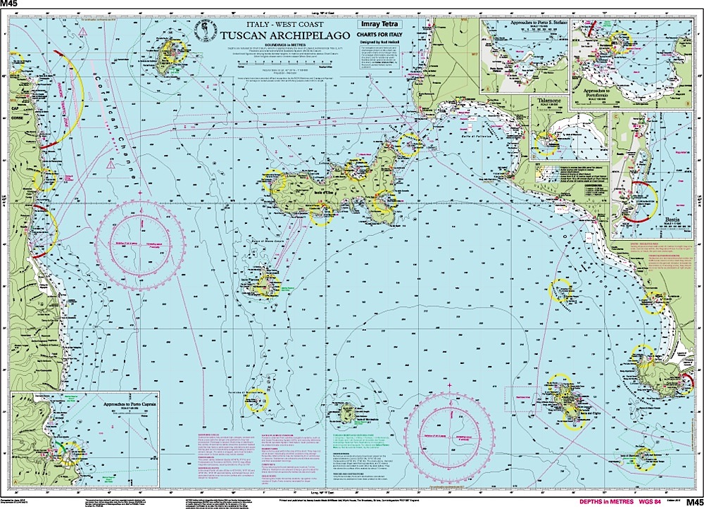 in plastica scala 1:180.000 Plans included: Plans included: Approaches to Porto Capraia scale 1:25.000; Approaches to Portoferraio scale 1:30.000; Bastia scale 1:17.500; Talamone scale 1:35.000; Approaches to Porto Santo Stefano scale 1:15.000.