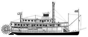 Famoso battello del Mississipi, dotato di una grande ruota motrice collocata a poppa. Questo sistema di propulsione costituì una evoluzione rispetto alle due ruote laterali, risultando meno veloce ma più robusto e funzionale, spe-cie per facilitare le operazioni di carico e scarico dei passeggeri e delle merci. In sei tavole: piano di costruzione, illustrazione per la realizzazione dello scafo con il sistema a tavolette, vista di fianco, vista dall'alto e varie viste prospettiche.