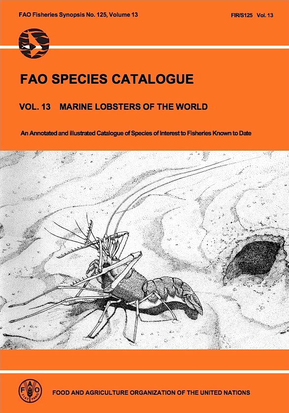 The present volume on marine lobsters includes 149 species in 3 in fraorders, 10 families and 33 genera. There is an introductory section that supplies general remarks on the biology and fisheries of lobsters, a glossary of technical terms, illustrated keys to infraorders, superfamilies, families, subfamilies and species, and detailed accounts on species. Species accounts include illustrations of the species and their distributions, and information on scientific and vernacular names, types, distribution, habitat, biology, size, interest to fisheries, and relevant literature. Following the species accounts is a table of species by major fishing area, an index, and a bibliography. Two original contributions to nomenclature are presented in this volume. A new subgenus, Sagmariasus, is erected under the palinurid genus Jasus. In addition, the new name, Callianassa biffari, is proposed to replace the junior primary homonym C. affinis Holmes, 1900.