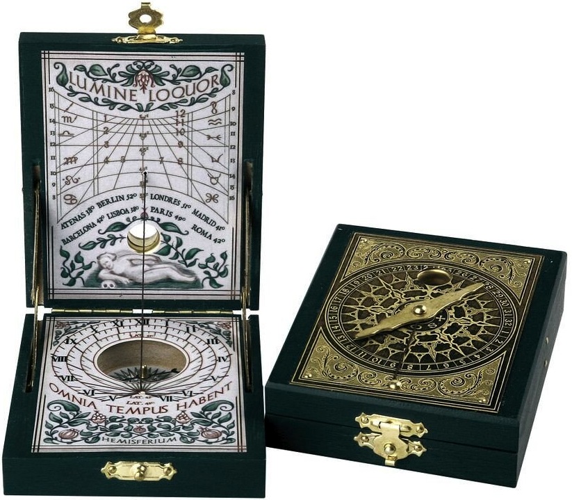 Quadrants with a compass, introduced in the 15th century, were the first portable sundials. The compass served to face the quadrant toward the north and the gnomon (a bit of cord or a flexible triangle) could be raised or lowered to accommodate the latitude where the compass is used. This model has Compass Rose in the upper part with a needle to determine the 32 different rhumbs. The golden age of sundials lasted from the 15th century to the end of the 18th.