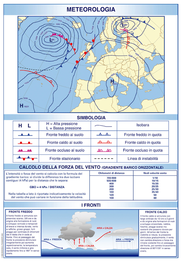 La simbologia delle carte sinottiche, il gradiente barico e l'intensità del vento in rapporto alla distanza tra le isobare, i fronti. Descrizione del materiale: tabellone didattico realizzato con un materiale innovativo molto resistente, in PVC opaco da 0,4 mm. Materiale rigido ma pieghevole, antiriflesso, adatto per gli interni, che non si danneggia, colori UV molto brillanti. Ogni tabellone è provvisto di due occhielli in metallo sul lato superiore per la messa in opera a parete.