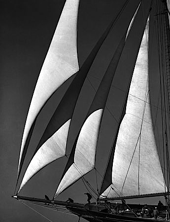 The headsail men aboard the three-masted schoonerMigrant take to the foot-ropes under the long bowsprit to gather in the big jib topsail about to be lowered away.Migrant was built in 1929 and at 223 feet overall was hailed as the largest schooner-yacht in the world. Photographed by Rosenfeld and Sons on October 2, 1934.
