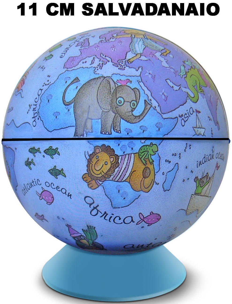 Miniglobo e salvadanaio per i più piccoli, cartografia disegnata da un' illustratrice di libri per l'infanzia. La base che ha funzione di lente di ingrandimento.