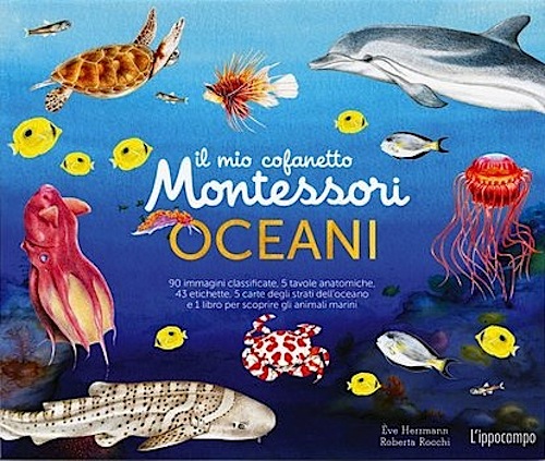 Riccio di mare, pesce farfalla eclisse, calamaro vampiro, squalo leopardo… Tuffarsi nell’universo degli oceani attraverso la pedagogia Montessori significa immergersi in un mondo affascinante e sorprendente, per scoprire la vita e i bisogni delle diverse specie in funzione del loro ambiente, dalla superficie fino alle acque profonde. Questo cofanetto contiene: 90 immagini classificate per scoprire 30 animali marini; 5 grandi carte da assemblare per osservare la profondità dell’oceano; 5 grandi tavole anatomiche degli animali marini e 43 etichette da ritagliare; 1 libro di 48 pagine per esplorare questo mondo misterioso fin nei minimi dettagli.