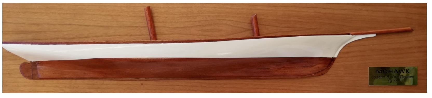 Deusen altered and re-built the former Hirondelle, built in 1866 by Forsyth & Morgan and better known as Dauntless, sharing the honor of defending the Americas Cup with Sappho for the second challenge. The following year, he launched Columbia, another Cup defender. A shy, deliberate men, Van Deusen was not able to stand up to the extravagant demands of his customers and with Mohawk, those of William T. Garner in particular. It is unfortunate that this fervent exponent of the rule-of-thumb did not live long enough to fully appreciate the limits of his art. "Mohawk's" Tragic End In 1875, Mohawk was the queen of New York's racing fleet and the largest competitive yacht on American waters. Mohawk's owner was a 35-year-old textile magnate named William Garner. Wide-bellied and flat-bottomed, Mohawk carried over 20,000 square feet of canvas and measured 140 feet overall. She had an extraordinary 30-foot beam and a draft of only six feet with her centerboard up. These unusual features made Mohawk difficult at the helm, but extremely fast downwind. She performed well during her first season of competition: Which became her last. On the afternoon of Thursday, July 20, 1876, the schooner was anchored at Stapleton, Staten Island, NY, under a cloudy sky with occasional showers. In spite of the dreary weather, Mohawk's owner boarded along with his wife and five guests for a short sail. As the crew hoisted the schooner's sails a sudden shower sent the visitors below. About 4 p.m. the captain ordered the anchor raised. But as the crew began to hoist a sudden gust of wind raced across the harbor and tipped Mohawk violently to port. Abruptly, however, she began to right herself to the relief of all aboard. Suddenly a stronger gust hit and knocked Mohawk flat. The wind held her down and she literally sailed under the waves. Garner, realizing the schooner's fate, rushed below in search of his wife. The cabin, fast filling with water, was in chaos. A number of 150-pound lead ingots, carried as ballast, had smashed through the deck and slid down the port side on top of her. Garner attempted to pull her out, but it was useless. In addition, the dislocated ballast made it impossible for the yacht to right herself. Two guests managed to escape up the companionway and another was able to swim out through a smashed skylight. The rest of those on board sank with the Mohawk in less than 10 minutes. Garner, his wife, two friends and a cabin boy perished in the sinking. A coroner's inquest found the captain innocent of any wrongdoing and blamed the schooner's design for the tragedy. Her broad beam, shallow draft and dependence on unsecured internal ballast for stability was deemed the cause of the yacht's capsizing.