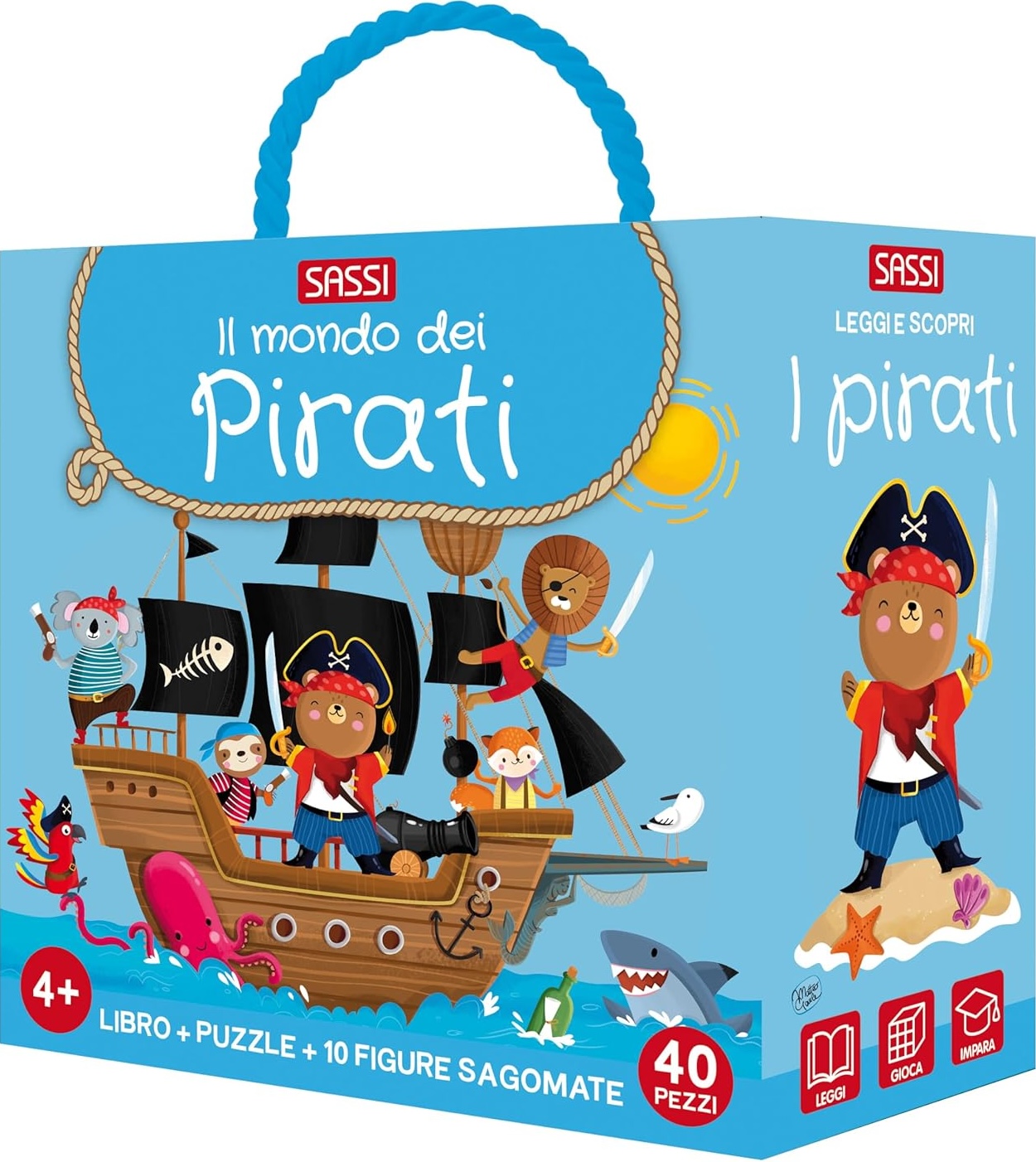 Grandi avventure ti aspettano con i pirati! Sfoglia il libretto, costruisci il puzzle e impara a riconoscere i vari elementi che caratterizzano il mondo dei pirati. una scatola abbellita da dettagli iridescenti che contiene un libro di 10 pagine, un puzzle di 40 pezzi e 10 figure sagomate del mondo dei pirati da assemblare e posizionare sul puzzle, per imparare a riconoscere e associare elementi e parole. Età di lettura: da 4 anni.