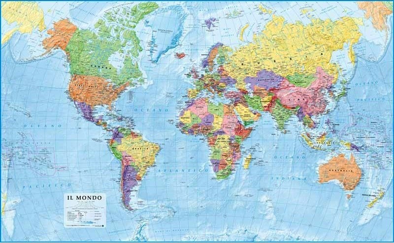 Una cartografia aggiornatissima dove è stata dedicata particolare cura sia all’aspetto grafico sia all’esattezza e completezza dei contenuti. In particolar modo si è curata la selezione e la simbologia dei centri abitati per quantità di popolazione. La rappresentazione con sfumo della morfologia dei fondali marini conferisce originalità e indubbia bellezza agli spazi oceanici della carta. I classici colori che contraddistinguono le nazioni sono sovrapposti allo sfumo orografico, così da colmare informazioni proprie della carta politica e fisica.