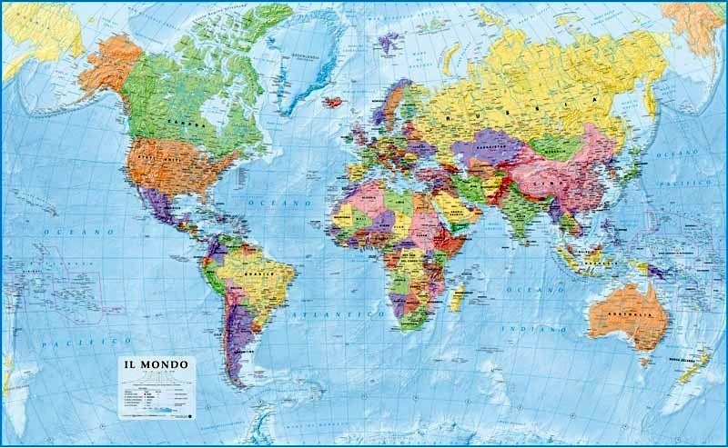 Una cartografia aggiornatissima dove è stata dedicata particolare cura sia all’aspetto grafico sia all’esattezza e completezza dei contenuti. In particolar modo si è curata la selezione e la simbologia dei centri abitati per quantità di popolazione. La rappresentazione con sfumo della morfologia dei fondali marini conferisce originalità e indubbia bellezza agli spazi oceanici della carta. I classici colori che contraddistinguono le nazioni sono sovrapposti allo sfumo orografico, così da colmare informazioni proprie della carta politica e fisica.