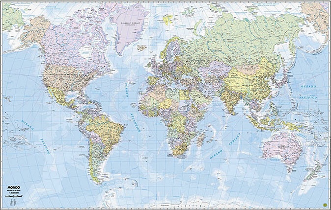 Bellissima carta murale basata sulla proiezione policonica di Van Der Grinten la carta rappresenta la suddivisione politica del mondo con una ricca varietà cromatica delle nazioni rappresentate. Le profondità marine sono evidenziate da una gradazione di azzurro e l’uso dei colori è regolato tra brillantezza e buona leggibilità. La toponomastica segue la dizione locale e la versione italiana è riportata tra parentesi. Le città si distinguono per grandezza con una simbologia appropriata. Sul retro è stampato l’indice dei nomi. Plastificazione opaca antiriflesso che permette ottima leggibilità in ogni condizione di luce. Le carte murali possono essere fornite in versione personalizzata, contattaci per i dettagli.
