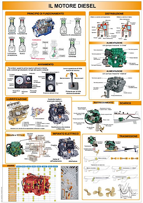 Il motore diesel spiegato in dettaglio mediante immagini schematiche e molto chiare: principio di funzionamento; avviamento; distribuzione e alimentazione; lubrificazione; scarico e raffreddamento; impianto elettrico; trasmissione; avarie. Descrizione del materiale: tabellone didattico realizzato con un materiale innovativo molto resistente, in PVC opaco da 04, mm. Materiale rigido ma pieghevole, antiriflesso, adatto per gli interni, che non si danneggia, colori UV molto brillanti. Ogni tabellone è provvisto di due occhielli in metallo sul lato superiore per la messa in opera a parete. Il tabellone viene fornito in tubo cartonato con tappi in plastica.