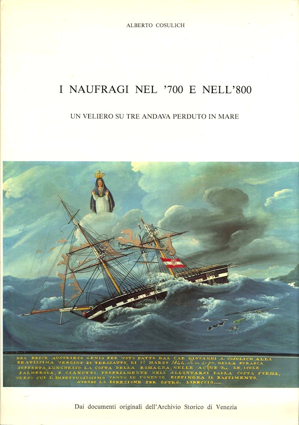 È l’esemplare n. 538 su 1.500 copie stampate in totale, dai documenti originali dell'Archivio Storico di Venezia. Con numerose illustrazioni nel testo. Alberto Cosulich, autore del volume, è nato a Venezia ed è il primogenito della famiglia che da tante generazioni svolge attività nel campo marittimo e navale. Dopo la seconda guerra mondiale, assieme al fratello Carlo, con grande impegno è riuscito a ripristinare la flotta di famiglia, riportando sulle ciminiere delle sue navi l’antico stemma dei suoi avi. Oltre che armatore, Alberto Cosulich è appassionato studioso di antica marineria e di etnografia e su tali argomenti ha scritto numerosi volumi. Un veliero su tre andava perduto in mare, recita il sottotitolo del libro: infatti emerge, dalle statistiche dell’epoca, questa altissima percentuale di disastri della navigazione. Chi andava per mare aveva un terzo delle probabilità di naufragare, ma se a ciò si aggiungono tutte le altre cause di morte, in particolare i singoli infortuni a bordo, le malattie, i contagi nei porti e le epidemie di ogni genere, dobbiamo concludere che si trattava di una attività ad altissimo rischio della vita. L’autore ha attinto dalle fonti storiche più certe, per far rivivere la documentazione di alcune storie vere del passato sulle quali era calato un totale oblio. I naufragi sono stati raggruppati nelle loro più frequenti tipologie: Naufragi per cause di mare cattivo; naufragi per cause di navigazione; naufragi per cause umane. Le foto d’epoca che corredano il volume sono tratte da testi inglesi e americani. La seconda parte del libro è dedicata agli ex voto marinari e la religiosità dei naviganti con circa cinquanta foto che riproducono gli ex voto di alcuni santuari in Italia.