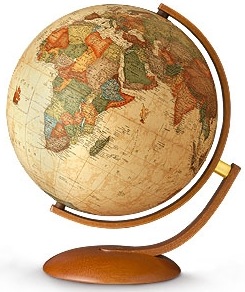 Globo geografico illuminato. Base e meridiano di moderno design in autentico legno color ciliegio. Arco girevole per una più facile consultazione.