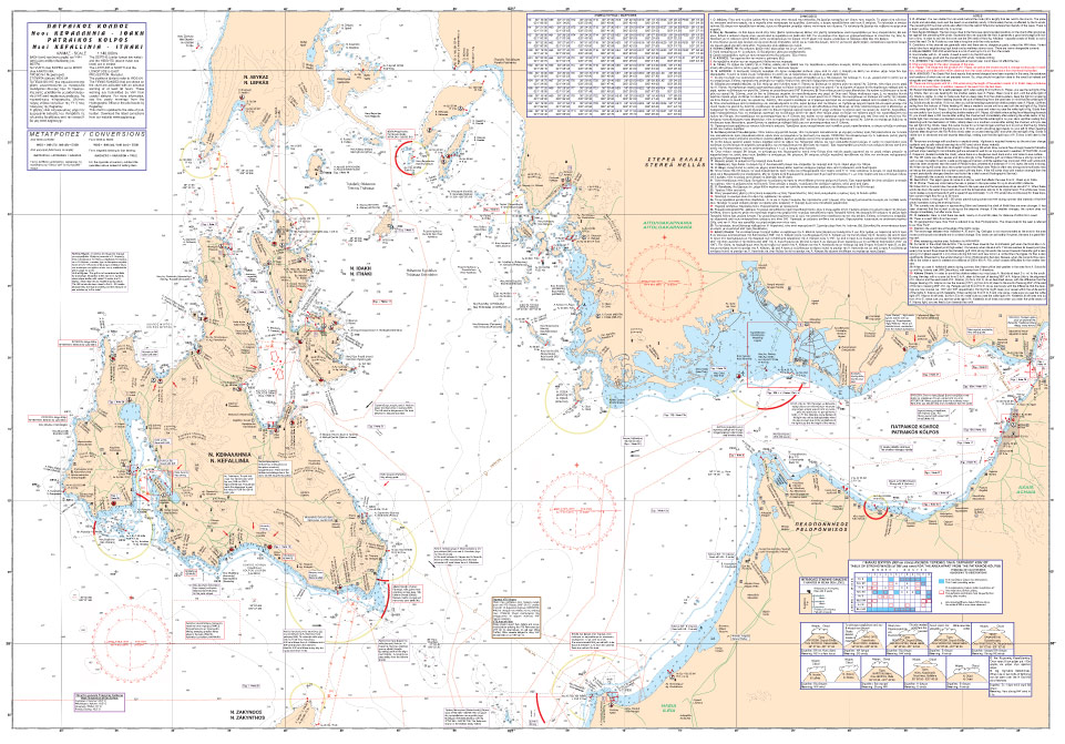 in plastica scala 1:140.000 From O. Vasilikí (Lefkáda) up to Río Antírrio bridge. Includes: Patraikós Gulf and Echinádes Sea; Islands Kefalloniá, Itháki, Meganísi, Kálamos, Kastós. Larger scale charts included in the back side: Río Antírrio bridge; Approaches and marina of Pátra; Mesológgi channel; Kyllíni harbour; Astakós harbour; Vathy bay and harbour (Itháki); Bay and harbour of Argostóli (Kefalloniá); Sámi and Lixoúri harbours (Kefalloniá); Fiskárdo bay (Kefalloniá).