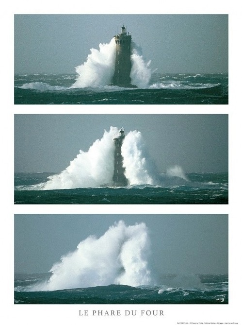 Le phare du Four, ou phare du Chenal du Four, est un phare-donjon situé au large de la commune de Porspoder dans le Finistère. Il était classé par ses gardiens dans la catégorie des "enfers". Le phare du Four, a été automatisé en 1993. Sur cette photo verticale, il n’est pas difficile d’imaginer l’enfer vécu par ses gardiens lors des nuits de tempête où chaque vague vient frapper l’édifice. Tous ces monuments font partie de notre patrimoine historique, mais nous rappellent également que les hommes qui assurent la sécurité en mer le font parfois au péril de leur vie. Que ce soient ceux qui les ont construits, ou ceux qui y ont vécu.