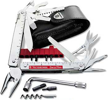questa robusta pinza con 35 funzioni e un fodero in pelle. Nel fodero troverete un verme cavatappi che all'occorrenza può essere innestato nella pinza, in un foro creato appositamente per questo modello, al fine di trasformarla in un cavatappi a strappo.