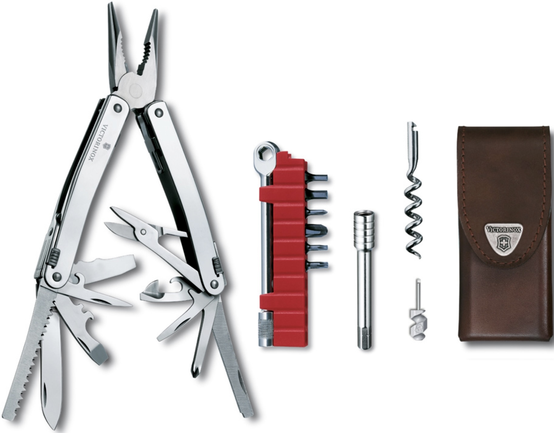 pinza multifunzione con becchi a punta - cacciavite 2 mm - cacciavite 3 mm - tagliafili per cavi fino a una durezza di 40 HRc - levacapsule - cacciavite 6 mm - apricasse - lama parzialmente ondulata - forbici - lima per metalli - sega per metalli - sega per legno - punteruolo-alesatore - cacciavite Phillips (1+2) - scalpello/raschietto - taglia guaine longitudinale - piegafili - spelacavi - raschiafili - apriscatole - gancio - incavo per cavatappi - tronchese per fili duri - foro per cordino - molle di bloccaggio - sblocco - fodero in pelle - porta bit - chiave per bit - inserto esagonale 3 - inserto esagonale 4 - inserto Phillips 0 - inserto Phillips 3 - inserto Torx 10 - inserto Torx 15 - spazio libero per altro bit - chiave a cricchetto - prolunga per bit