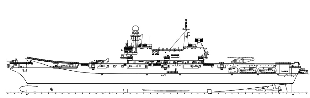 La portaerei multiruolo da 27000 tonn della Marina Militare Italiana, realizzata per costituire una piattaforma multiruolo ed interforze; con ponte di volo lungo 234 metri e due elevatori da 30 ton. Portaerei equipaggiata con aerei AV8B ed elicotteri EH 101; piattaforma logistica per forze di terra dotate di mezzi corazzati cingolati ed elicotteri d’assalto; unità di comando e controllo; nave ospedale per operazioni di soccorso a civili. Impostata nei Cantieri Navali di Riva Trigoso il 17 luglio 2001, consegnata alla Marina Italiana il 27 marzo 2008. Una documentazione realizzata da Gastone Piccoli su disegni originali di cantiere rielaborati e completati con gli aggiornamenti apportati al progetto iniziale. Piano di costruzione disegnato da Giancarlo Barbieri sulla base di documentazioni originali facenti parte del suo archivio personale. In quattro tavole che raffigurano la nave nell’allestimento attuale del 2012 con: piano di costruzione; viste dello scafo dal fianco destro, dal fianco sinistro, vista in pianta; viste da destra, da sinistra e dall’alto dell’isola. Tavola dei particolari in scala 1:200 e con ingrandimento a 1:100 per i più minuti.