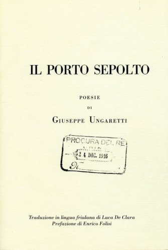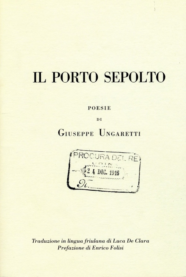 «La nuova pubblicazione della raccolta “Il porto sepolto” nell'edizione di Udine del dicembre 1916, allora stampata presso lo Stabilimento Tipografico Friulano, a cento anni dalla sua comparsa, oggi con la traduzione in lingua friulana ad opera di Luca De Clara, è innanzitutto un omaggio a Giuseppe Ungaretti, alla rilevanza del suo libro, all'importanza delle 32 poesie, per lo più brevi, scritte su piccoli foglietti di carta durante i momenti di pausa dai combattimenti ed edite con la guerra ancora in corso, destinate a dare nuovo indirizzo alla poesia italiana contemporanea. Pubblicate grazie all'interessamento di Ettore Serra che confesserà: "... Per leggere taluni dei sui versi lassù dimenticati, facevamo insieme la strada dalla filanda di Sdraussina a San Martino, oltrepassando il cavalcavia della strada ferrata e seguendo l'erta sassosa e nuda. Fu allora ch'io decisi di essere l'editore di Ungaretti”.» Di Enrico Folisi.