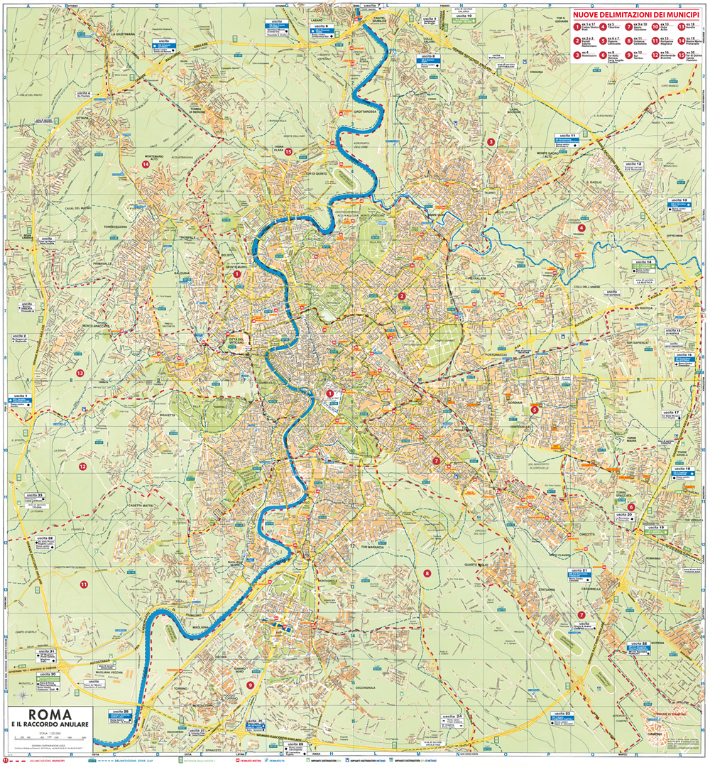 Pianta Murale aggiornata della città con le nuove delimitazioni dei 15 Municipi con tutte le uscite numerate del G.R.A., i GPL, i CAP, le stazioni ferroviarie ed il percorso della metropolitana. Allegato opuscolo con l'elenco delle strade.