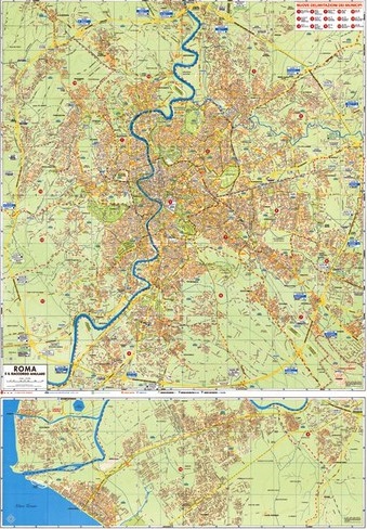 Pianta di Roma nel Raccordo Anulare aggiornata con le nuove delimitazioni dei 15 Municipi della città con tutte le uscite numerate del G.R.A., i GPL, i CAP, le stazioni ferroviarie ed il percorso della metropolitana, scala 1:20.000. Sul retro la pianta di tutto il Comune di Roma con le delimitazioni dei municipi, scala 1:50.000. 2 mappe in 1 Allegati opuscoli con elenco stradale.