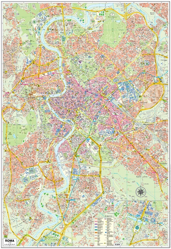 Plastificata con aste scala 1:12.500 cm.67X97. Sul retro sono riportati: Raccordo anulare, centro storico, rete tranviaria, linee elettriche, metropolitana, trasporti pubblici e pianta degli aeroporti.