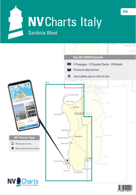 The Sardinian west coast should not be visited without the IT4. The set of charts starts below the town of Costa Paradiso, which bears the same name as the coast. The Gulf of Asinara begins with the wonderful harbour of Porto di Castelsardo. It is only a few nautical miles to the magical Stintino on a westerly course. If you want to circumnavigate the former penal colony Isola Asinara, you can simply shorten it with the passagio dei Fornelli. You should also set a course for the beautiful Sinis peninsula. There are hardly any harbours or bays along the way, especially since the waves and the underwater cliffs make approaching difficult. At Cap San Marco in the Golfo di Orsitano you can find shelter from the west wind. The next destinations are the two charming offshore islands Isola di San Pietro and Isola di Sant'Antioco. Even in the off-season, a trip is very possible due to the pleasant climate of Sardinia. Thanks to the clear structure the skipper can quickly find approaches, harbours and anchorages and is informed of important navigational details that also appear in the NV Charts app. The chart series impresses with its optimal scales and balanced sheet cuts.