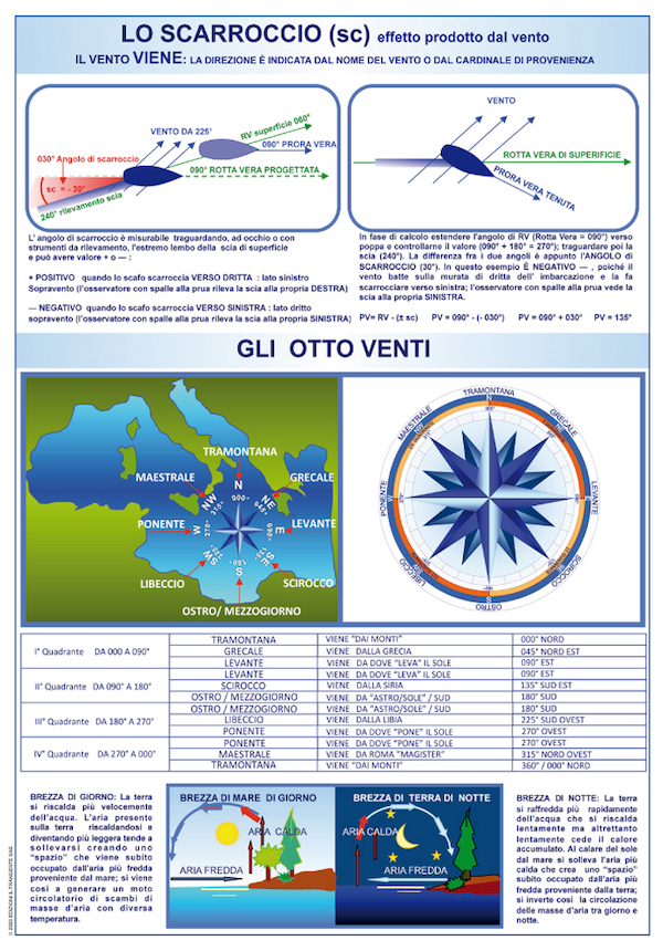Il vento e lo scarroccio, effetto sul moto dell’imbarcazione, il calcolo della prora, il nome degli 8 venti, i 4 quadranti, le brezze. Descrizione del materiale: tabellone didattico realizzato con un materiale innovativo molto resistente, in PVC opaco da 0,4 mm. Materiale rigido ma pieghevole, antiriflesso, adatto per gli interni, che non si danneggia, colori UV molto brillanti. Ogni tabellone è provvisto di due occhielli in metallo sul lato superiore per la messa in opera a parete.